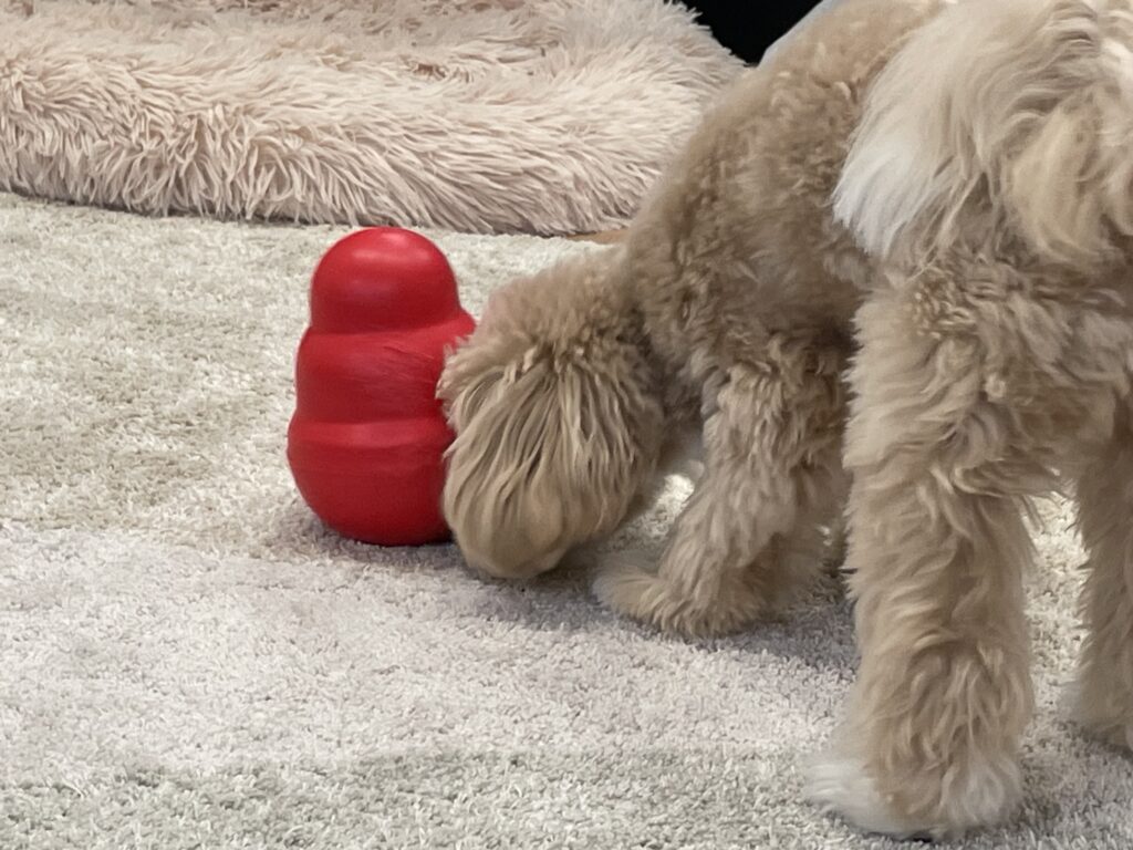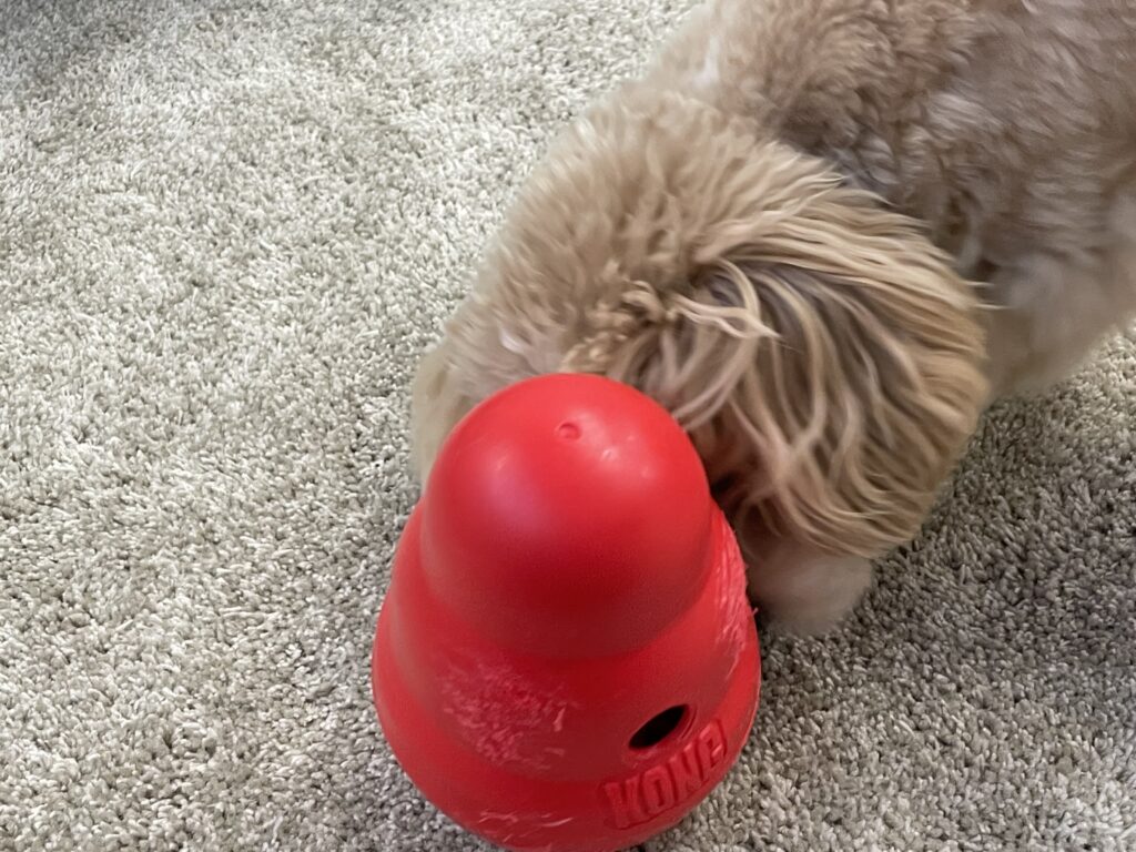 起き上がりこぼしのようなコングで、中にご飯を入れて倒しながら少しずつ食べられます。