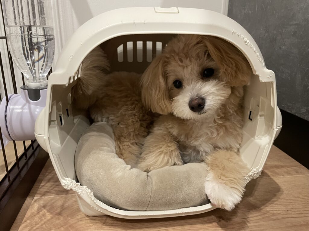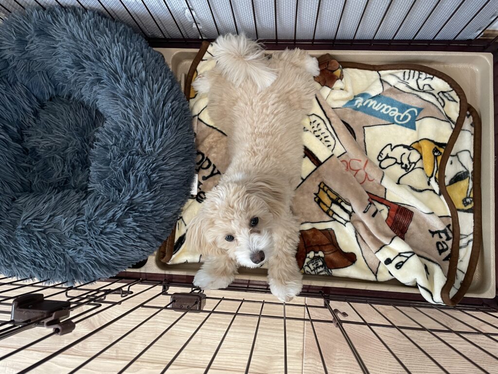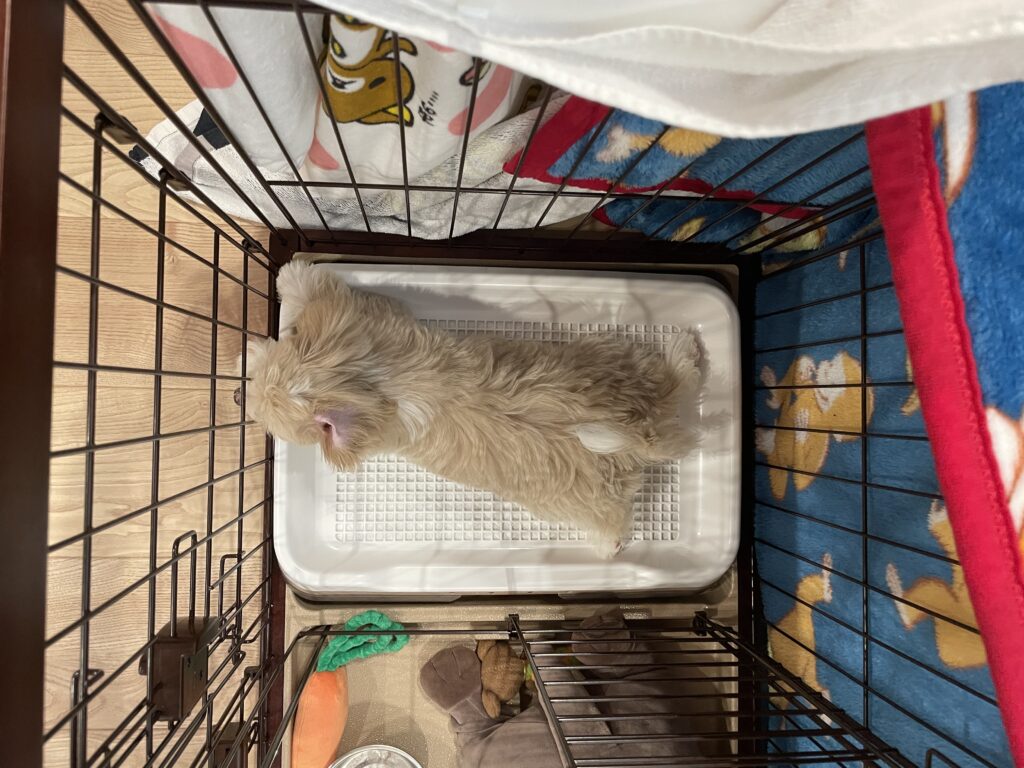 クレートにも身体が収まりきらず、大きいのを買いました。