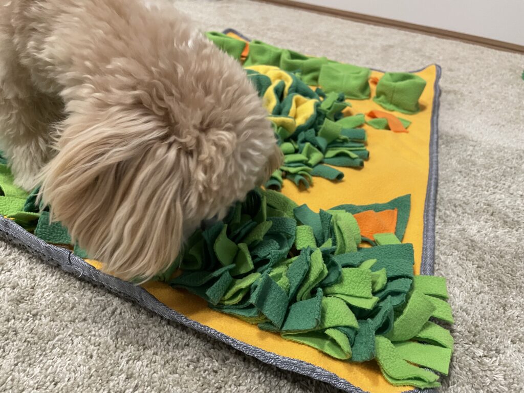 さらに、もう半分の朝ご飯を入れた知育玩具を与えて、きなこが夢中になっている間に家を出ます。