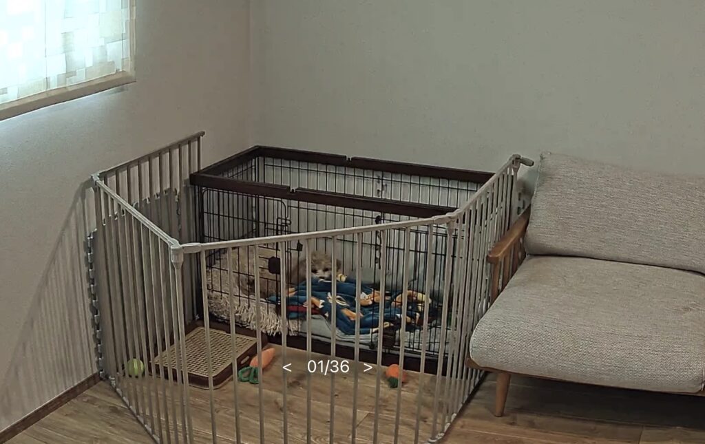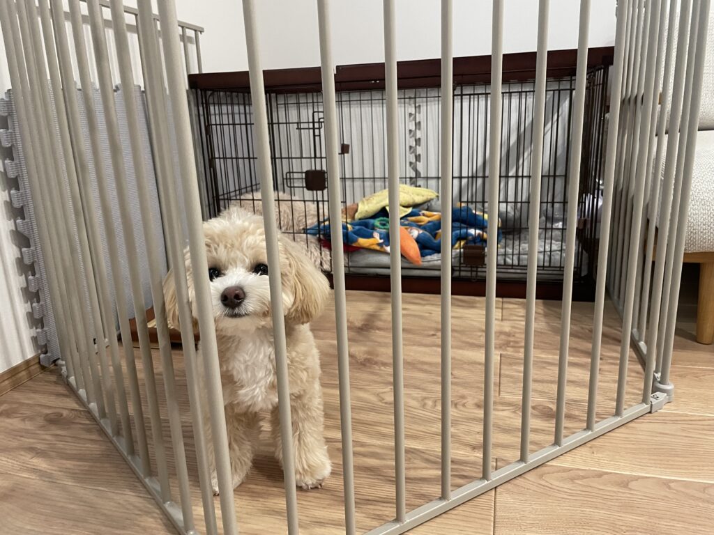 現在はサークルと少しのスペースで留守番をしてもらっています。