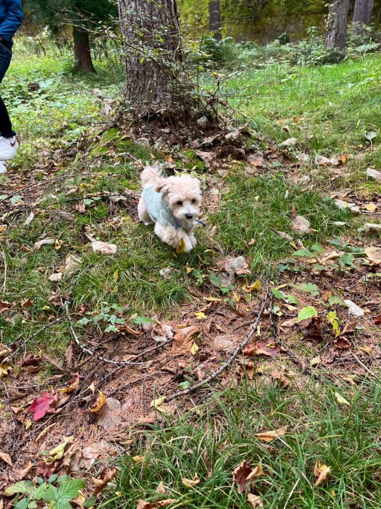 森の中のお散歩は初めてで、きなこは大はしゃぎ。